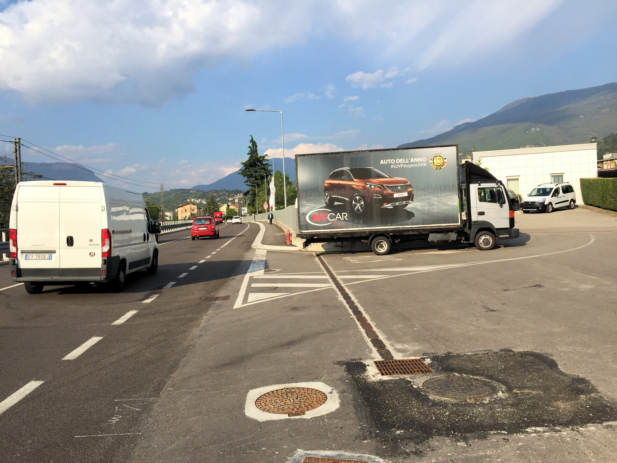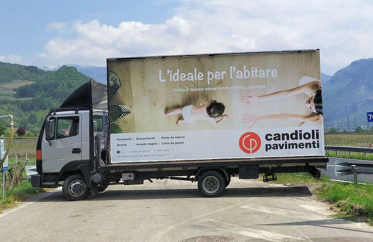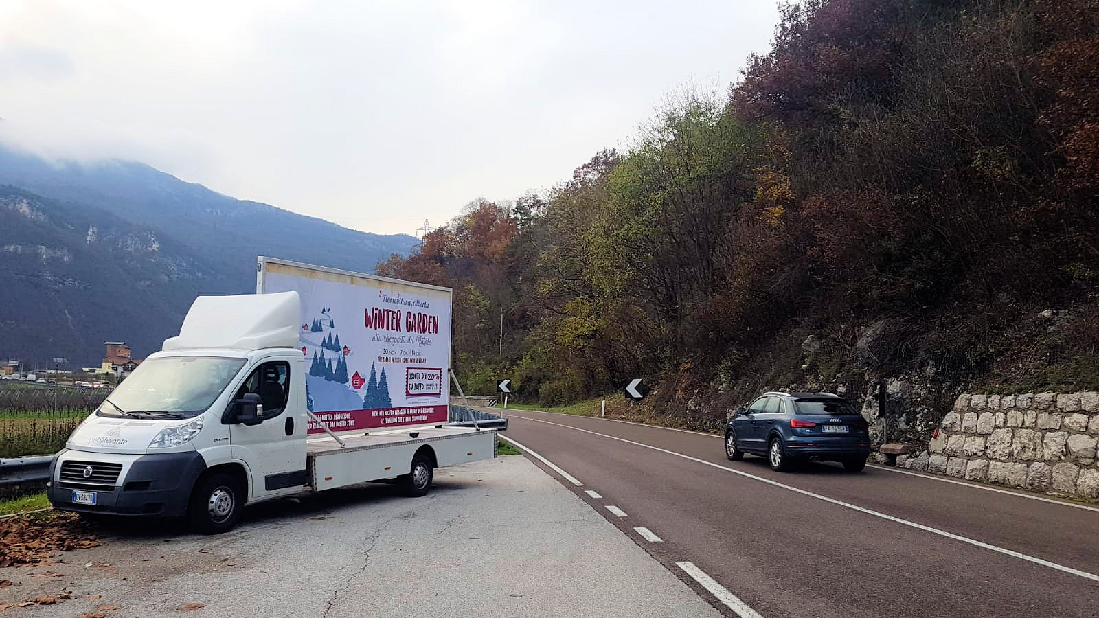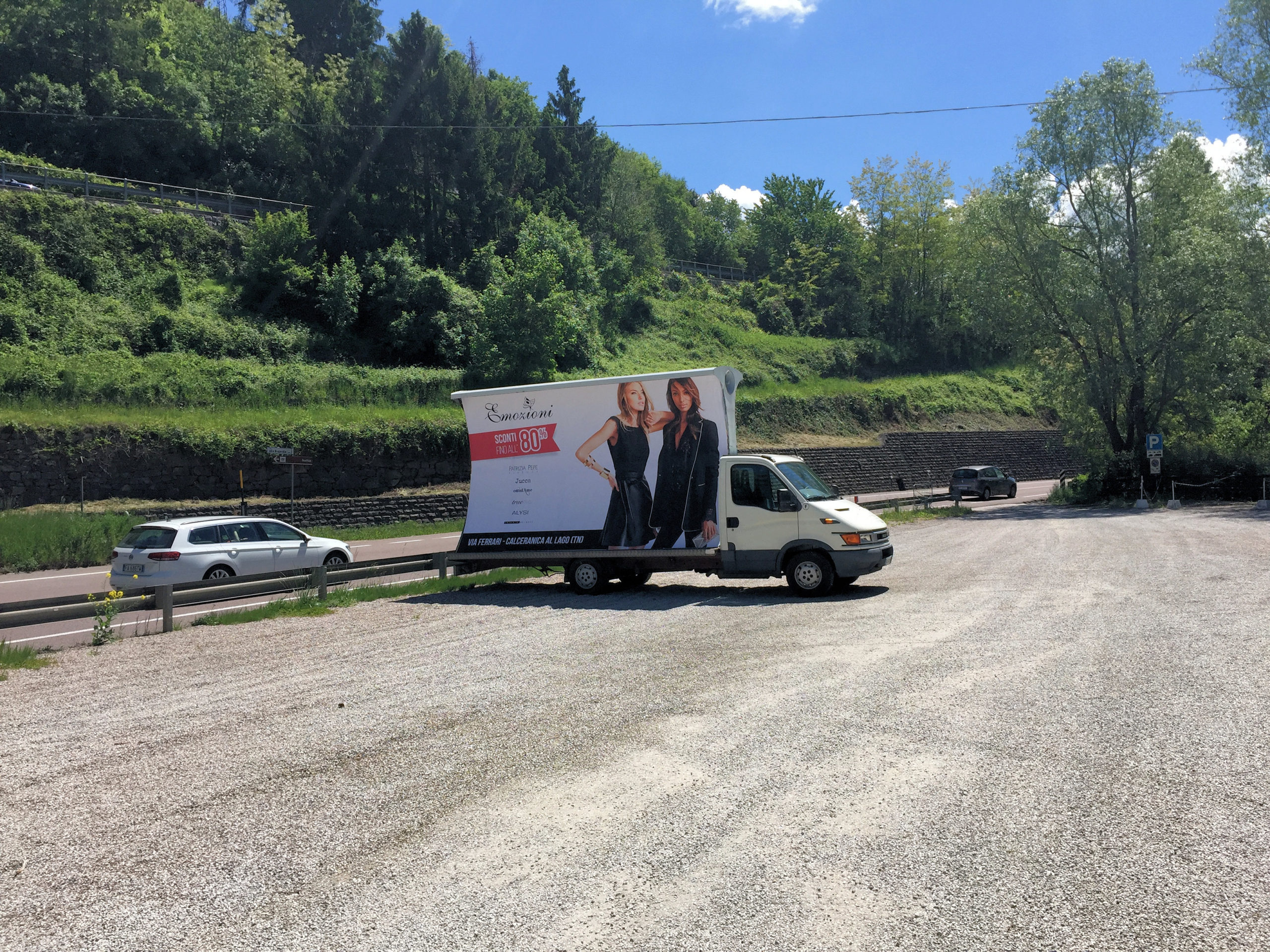 In movimento o Itinerante con soste programmate: il camion vela pubblicitario viene posizionato in punti di massima concentrazione e di massimo impatto visivo, viene poi spostato ogni 48 ore (per legge).